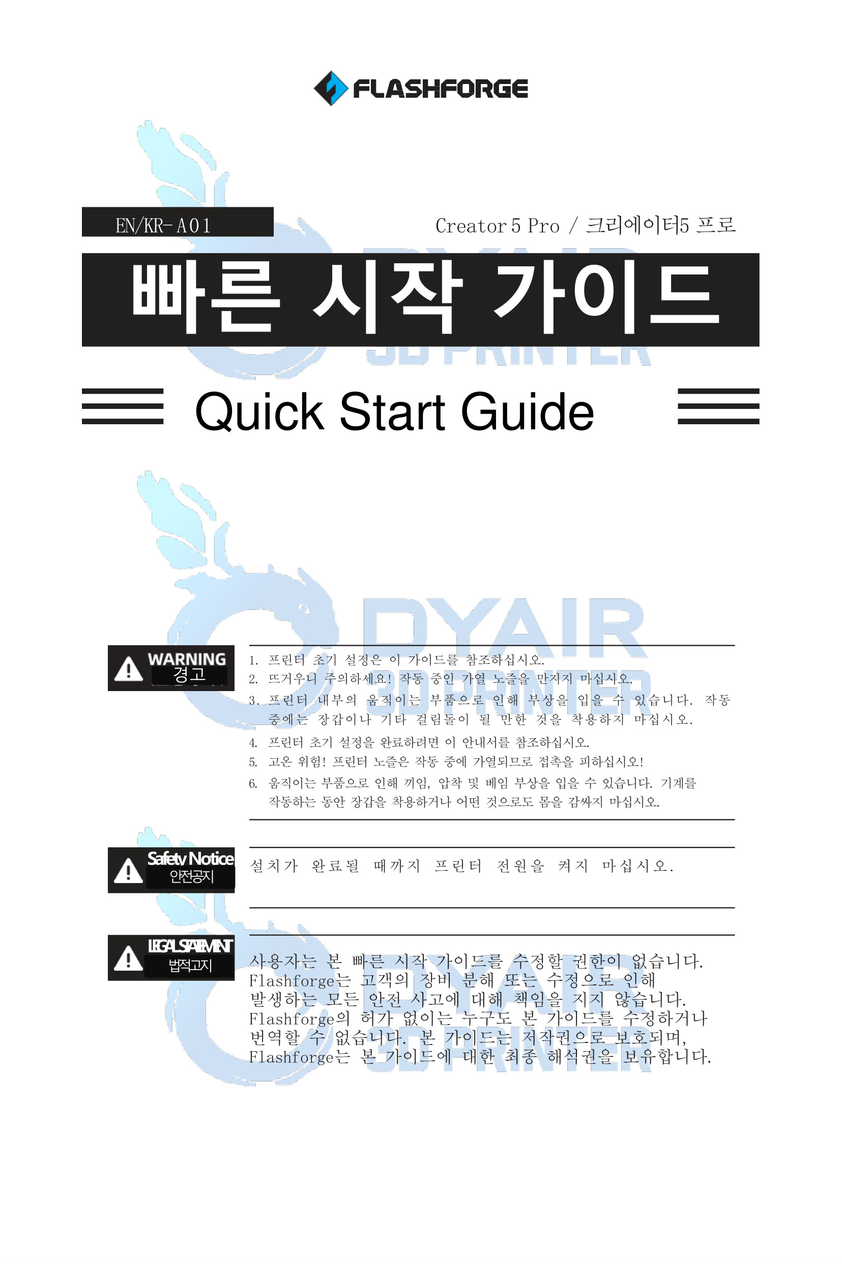 작동 중인 노즐은 매우 뜨거우니 절대 만지지 말 것, 움직이는 부품에 끼이거나 베일 수 있으니 작동 중에는 장갑이나 헐렁한 옷을 착용하지 말 것을 강조하고 있어요. 또한 설치가 완전히 끝날 때까지 전원을 켜지 말라는 안전 공지와, 이 가이드를 무단으로 수정하거나 번역하면 안 된다는 법적 고지도 포함돼 있습니다.